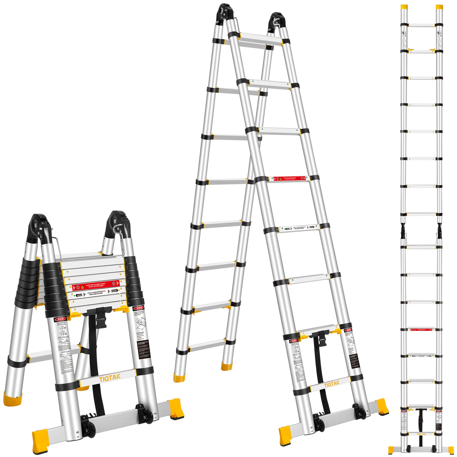TIQTAK Telescoping Ladder A Frame 18.4 FT Aluminum Extension Collapsible Ladder with Stabilizer Bar Wheels Multi-Purpose Extendable Ladder Portable for Household or RV Work