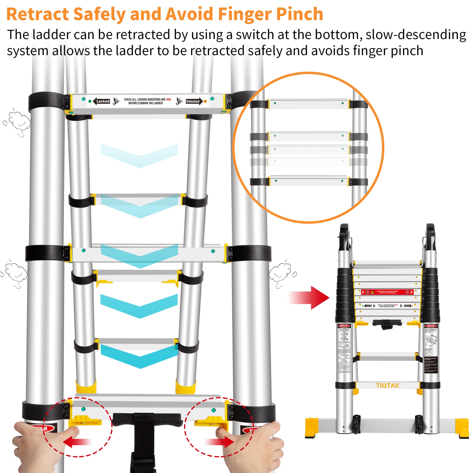 - One Button Retraction: Convenience is key. Our telescoping aluminum ladder has one-button retraction function. Simply press the thumb buttons, ladder will slide down smoothly from its full extension