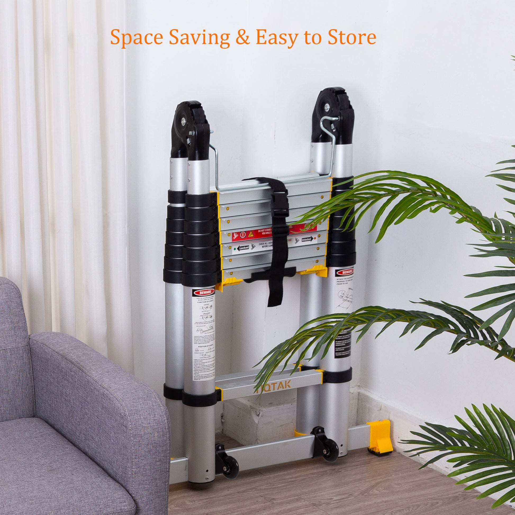 - Easy Carrying and Space Saving: Telescopic extension ladders differ from traditional ladders in that they make carrying and storing more convenient and take up less space. Can be stored under the bed, behind the door, or put on your truck. Tilt the ladder slightly, you can easily move it with wheels on the balance rod